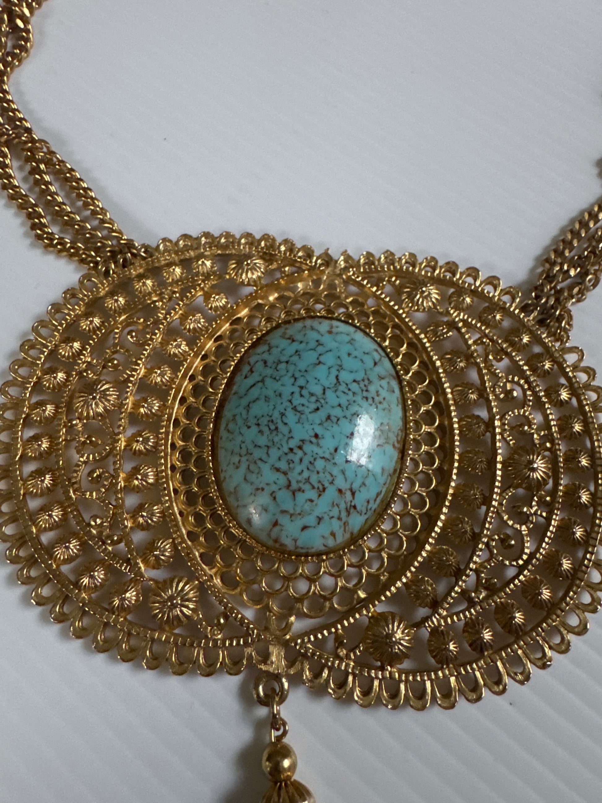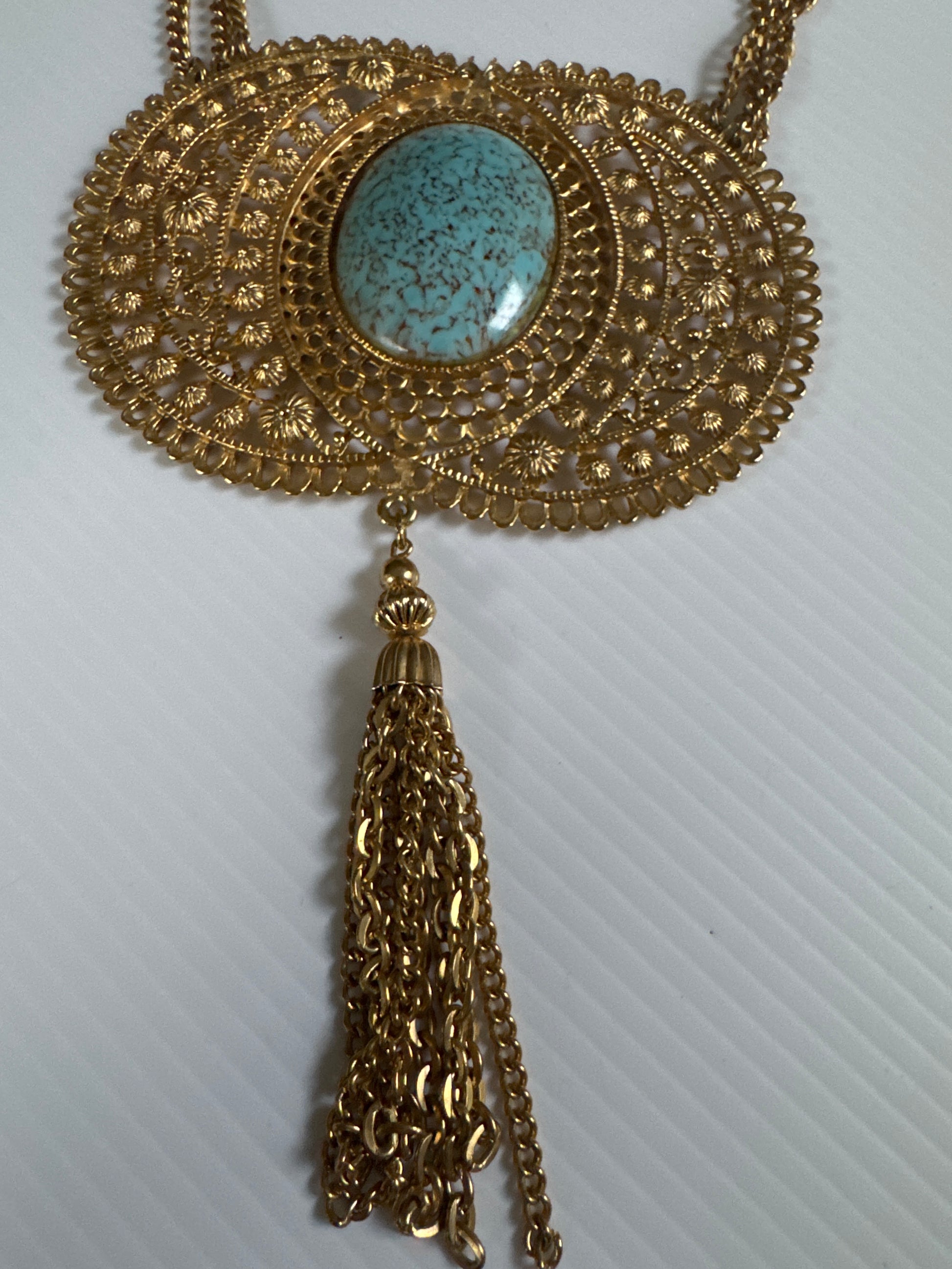 Vintage 1960s jumbo gold tone, triple chain pendant necklace with turquoise stone and fringe dangling
