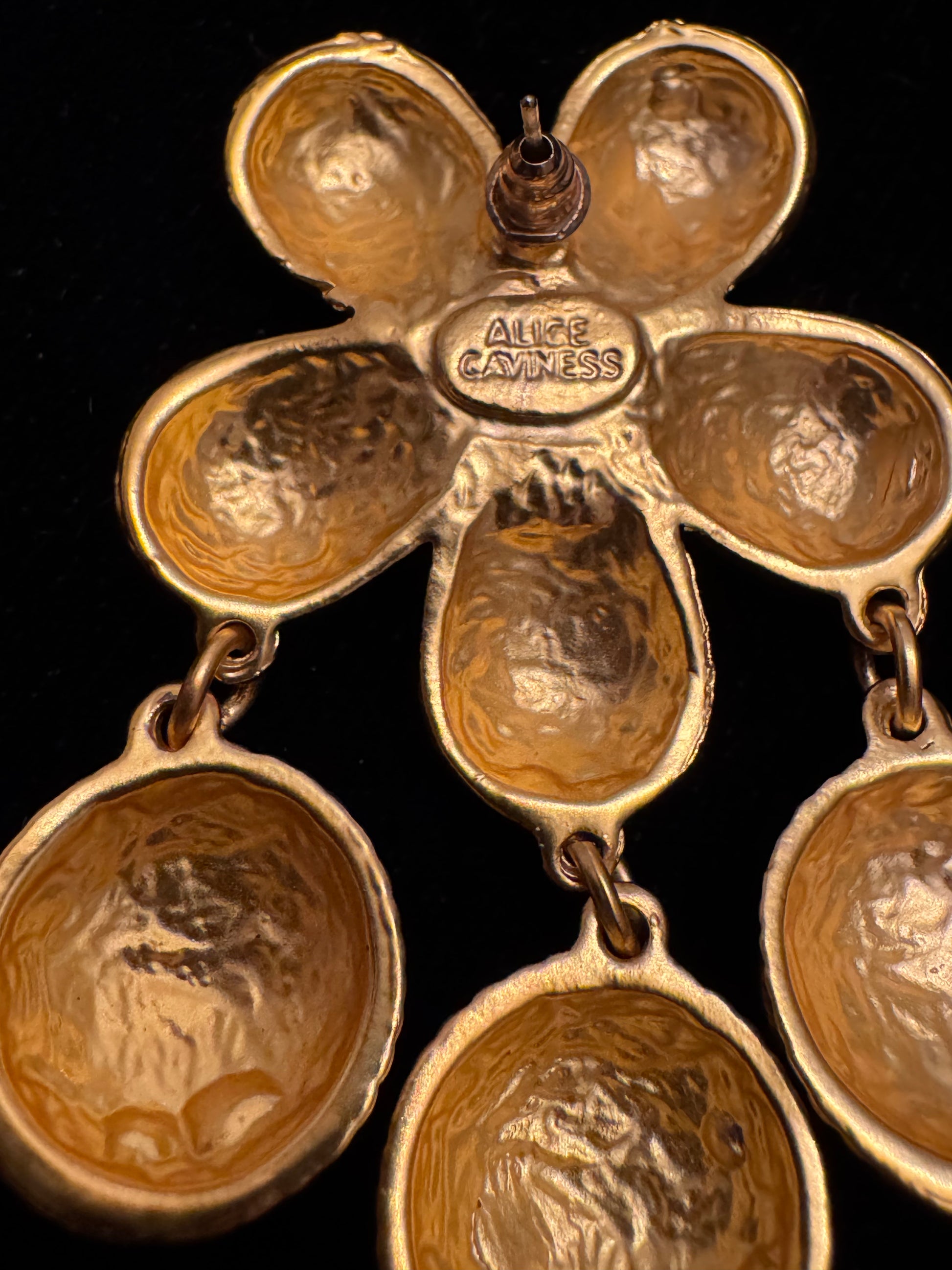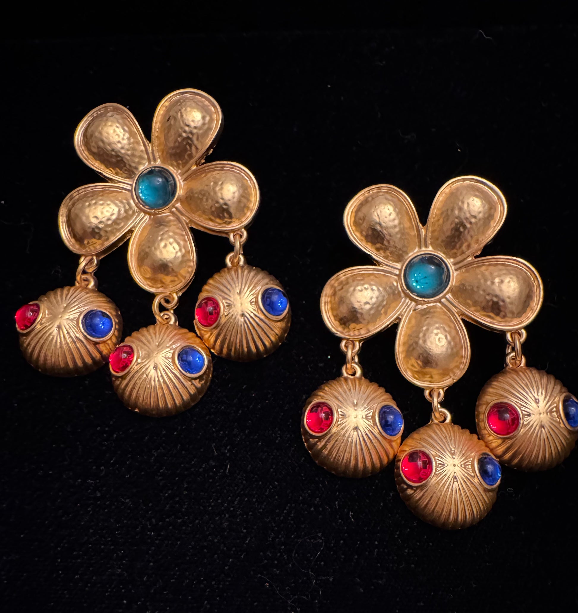 vintage 1960s signed Alice Cavaness gold plated pierced earrings with Jewel-tone red, blue, and green cabochons. France.