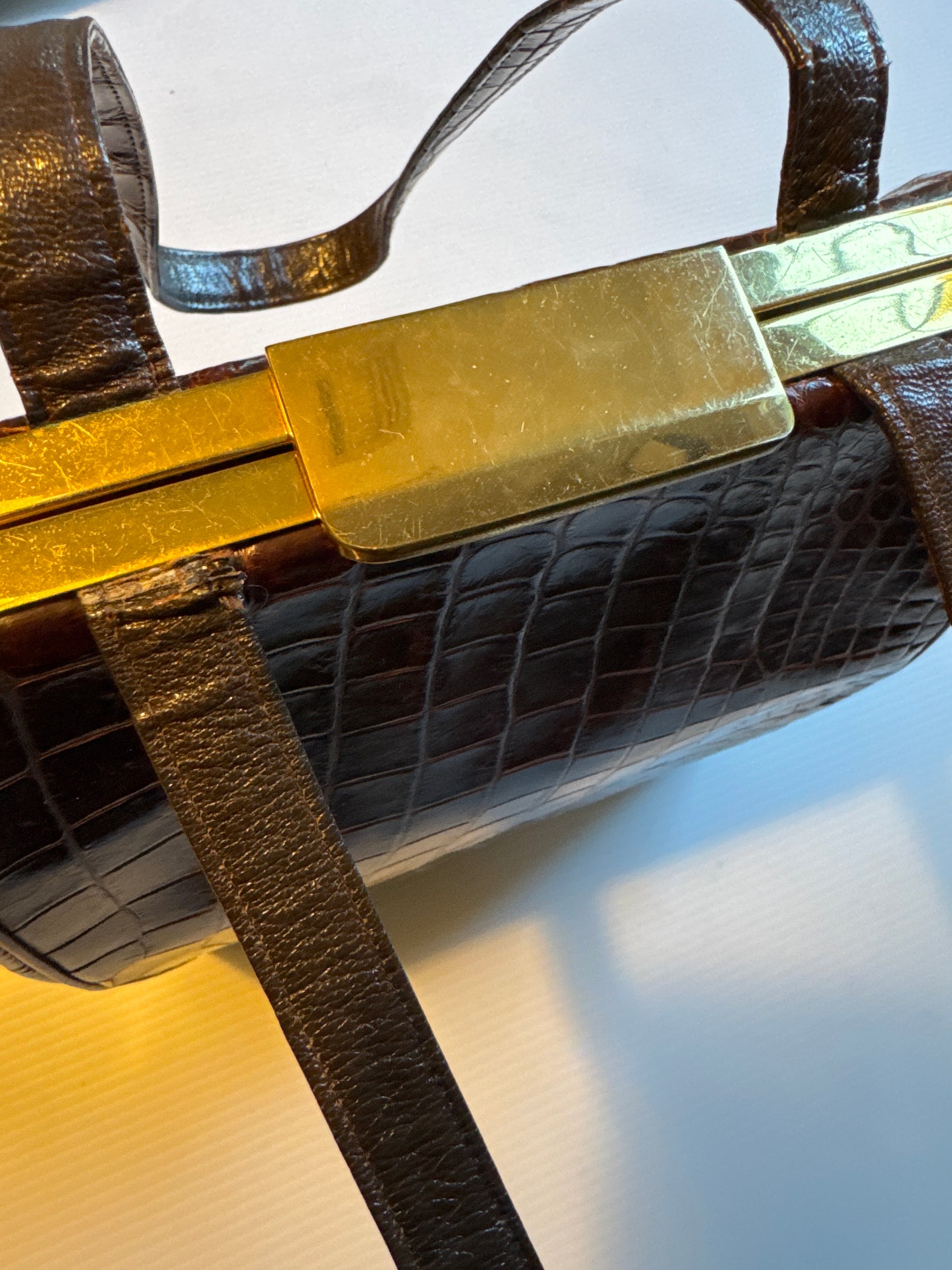 Vintage 50s Deitsch brown alligator double handle handbag. lined in a brown leather with pockets on both sides and comes with a mirror, comb and attached coin purse.