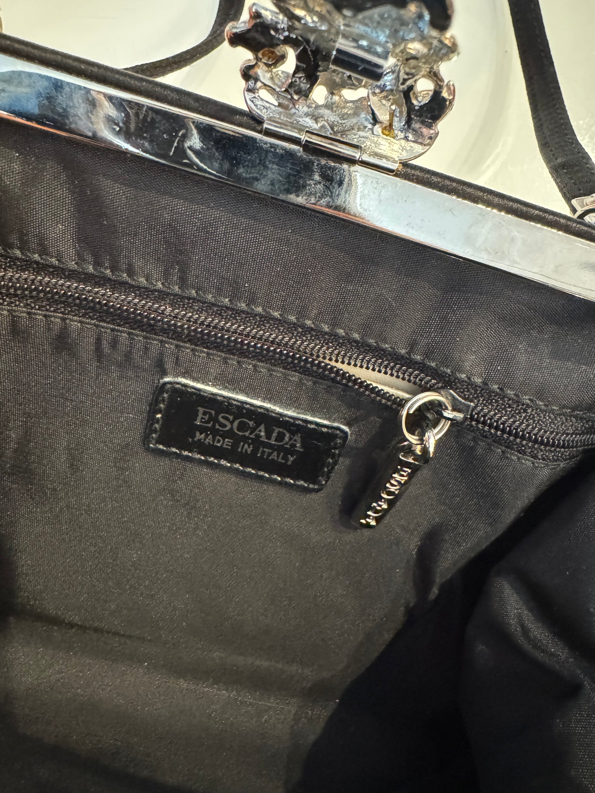 Vintage Escada black satin bag with rhinestones and removable shoulder strap with dust bag. Oscar worthy! see photo for missing stones