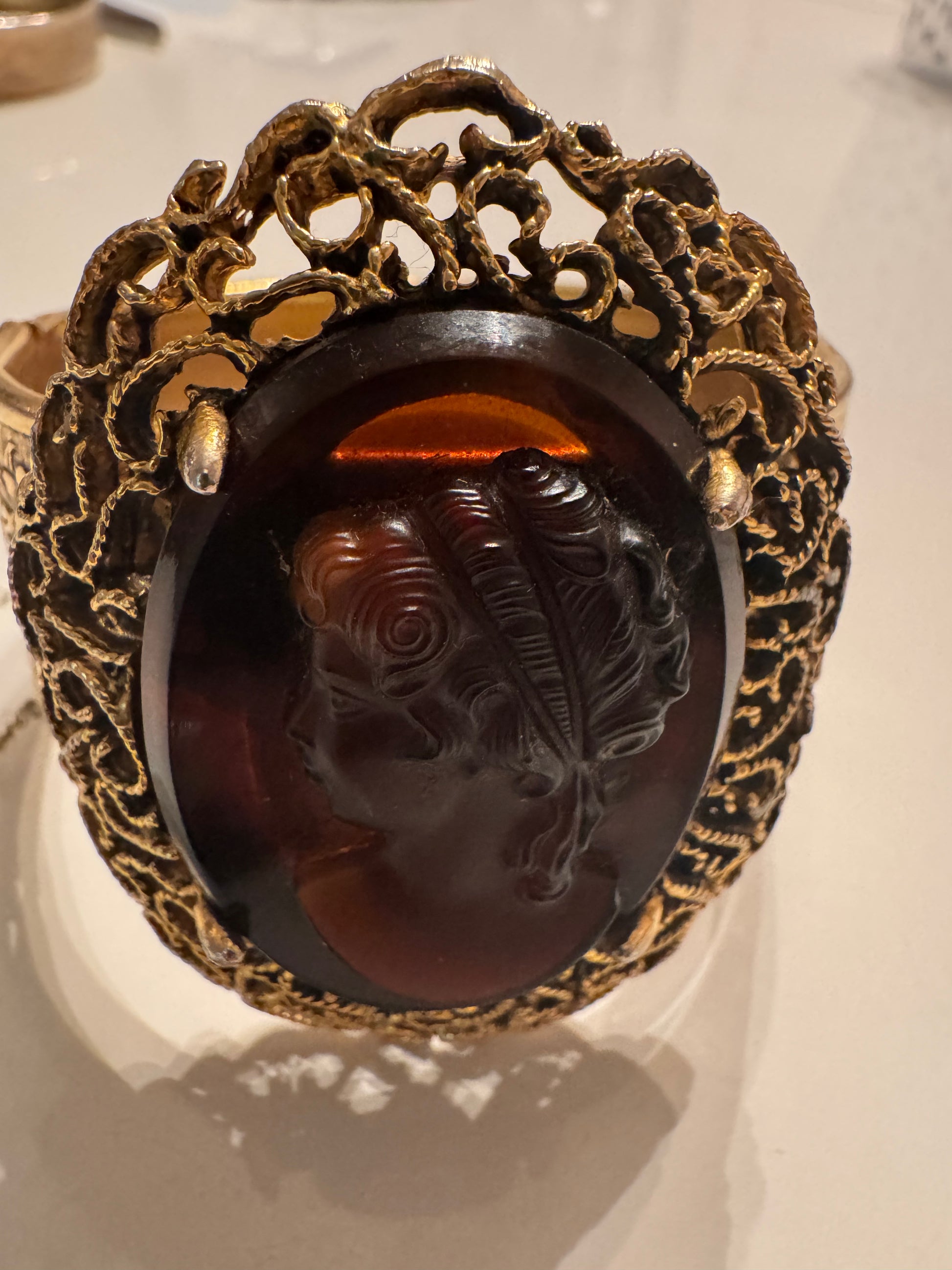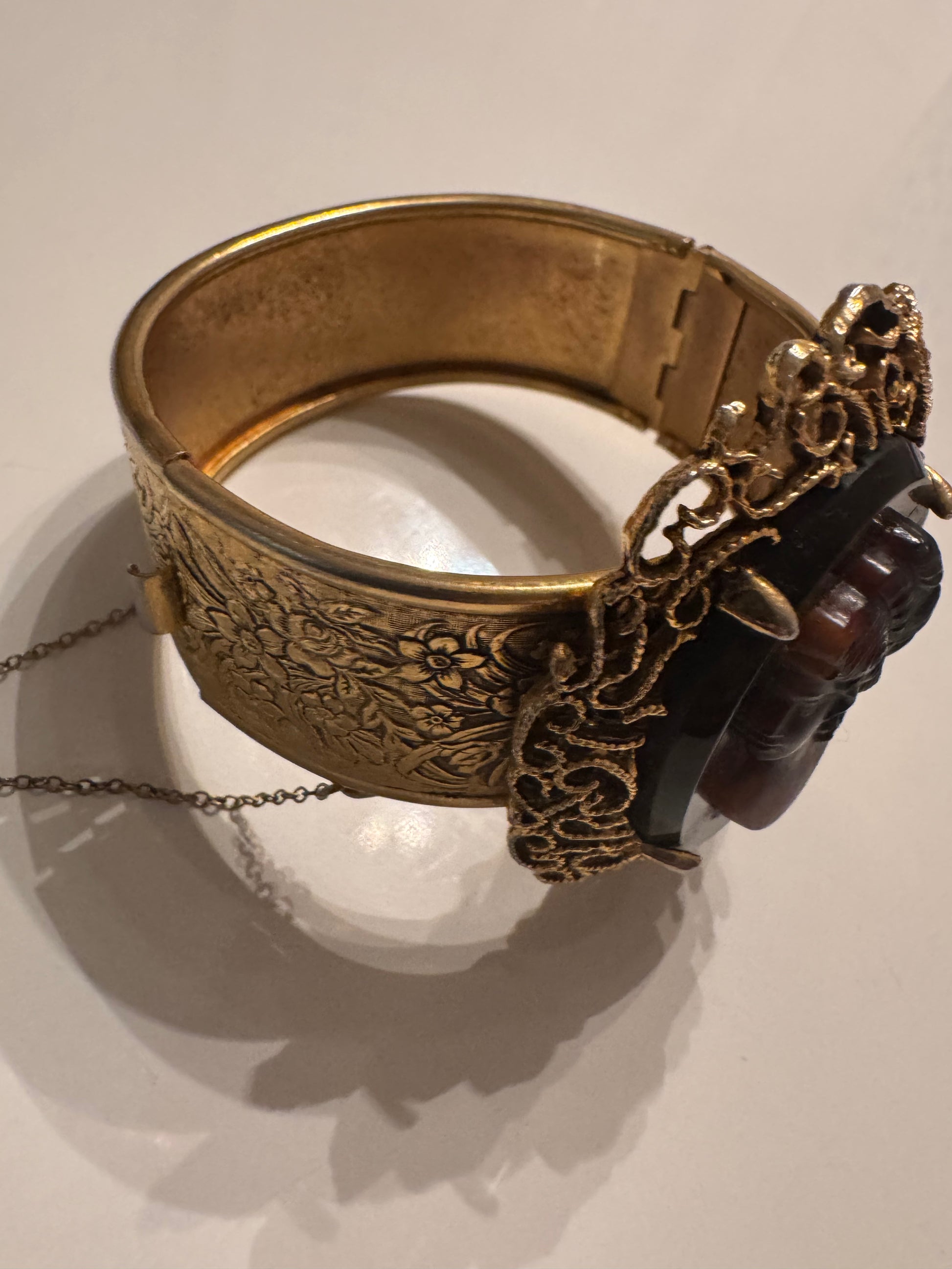 Vintage gorgeous tortoise lucite gold tone bangle bracelet with safety latch