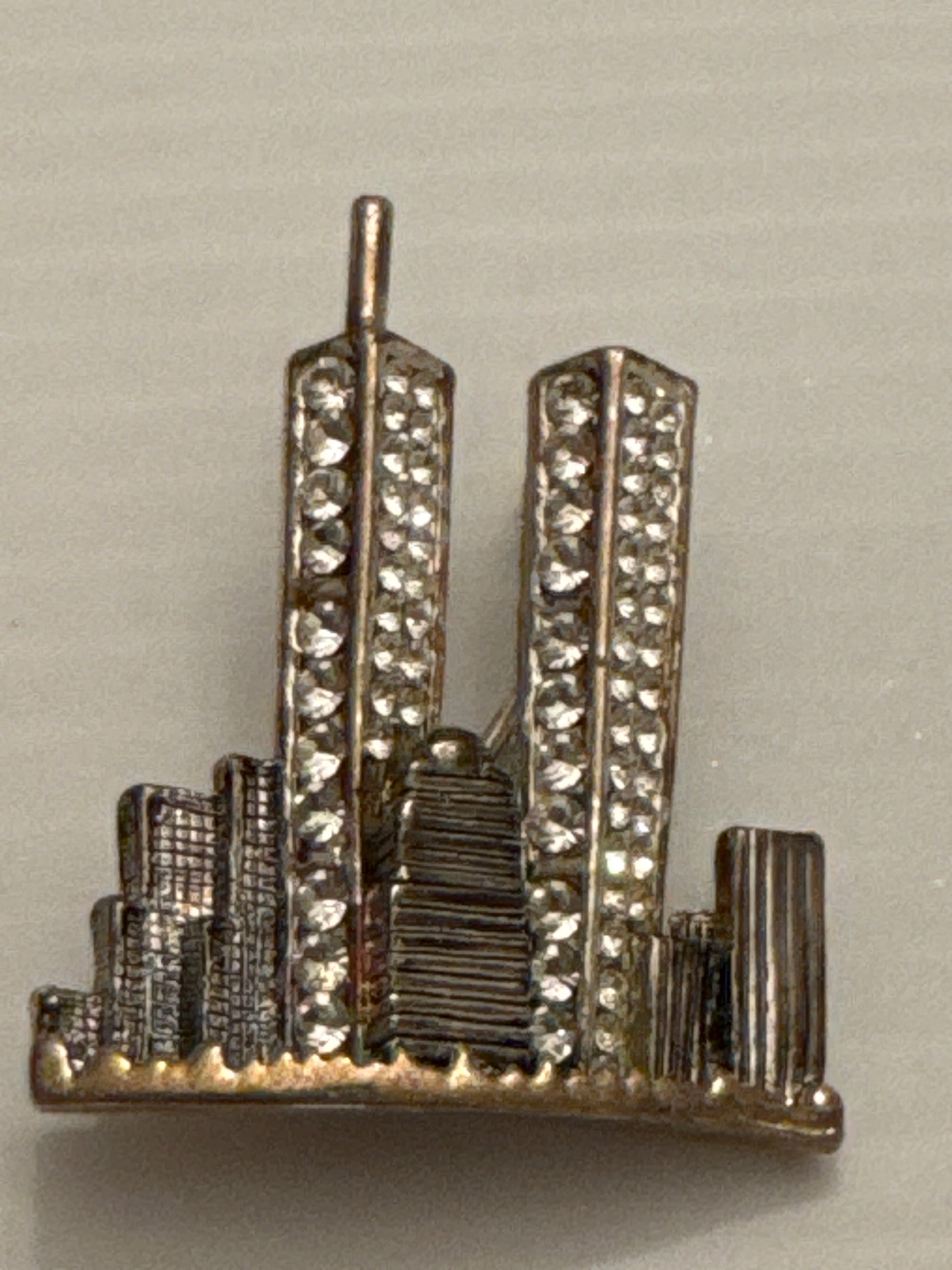 Vintage twin tower Silvertone with rhinestone brooch. entire proceeds of sale donated to Tunnels to Tower charity.